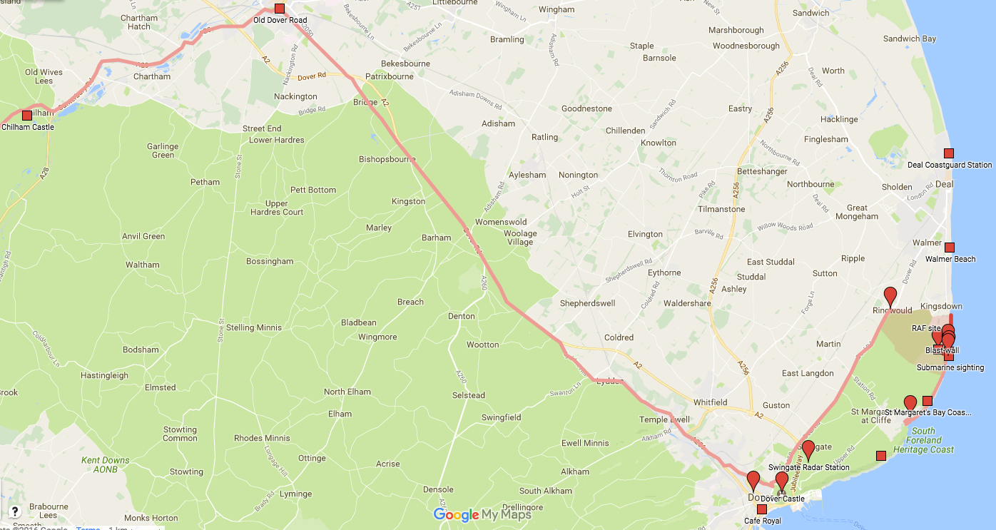 The rest of the trip to the launch site at Kingsdown is not described in detail but we can assume it follows the same route as Bond’s drive in chapter 10. After Chilham Castle it was a right turn at Canturbury into the Old Dover Road.