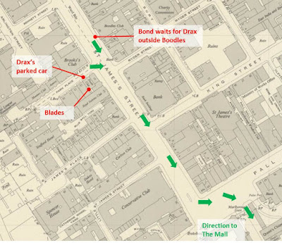 Blades of course is a fictional club but is a based on a mixture of other clubs in the area of St James. The exterior appears to be similar to the nearby Boodle's club but the location is that of Pratt’s club on Park Place (which Fleming renamed Park Street). Bond parks outside Boodle’s where he can keep an eye on Drax’s car around the corner.